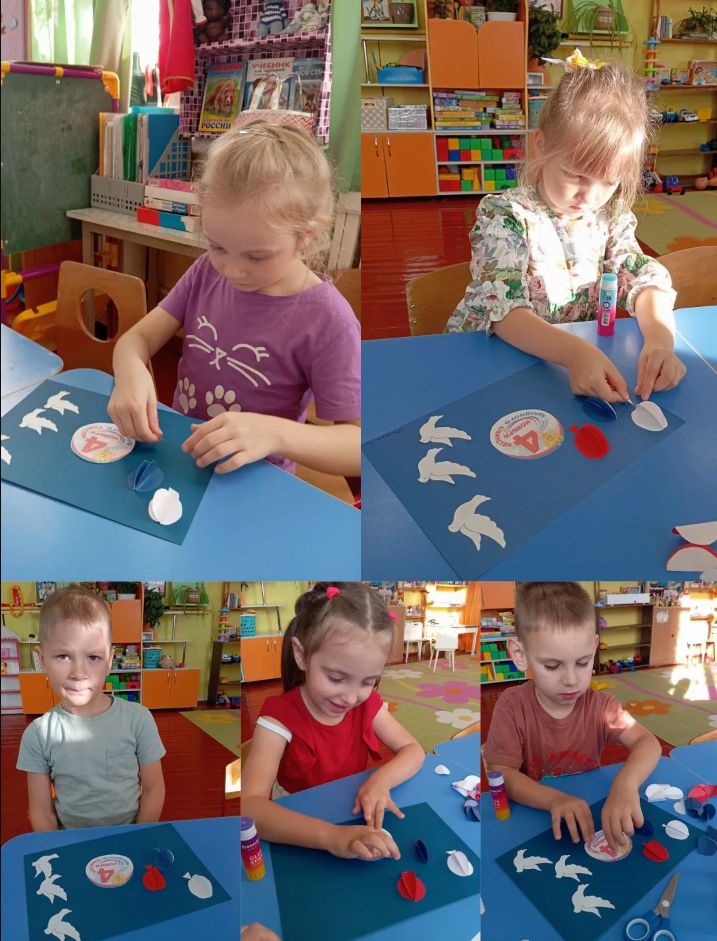 Эта работа стала не только красивым украшением нашей группы, но и напоминанием о том, что самое главное – это мирное небо над головой, детство без страха и возможность расти и развиваться в безопасном мире. А также изготовили белый голубей на палочке "Голубь мира", а вечером подарили родителям.